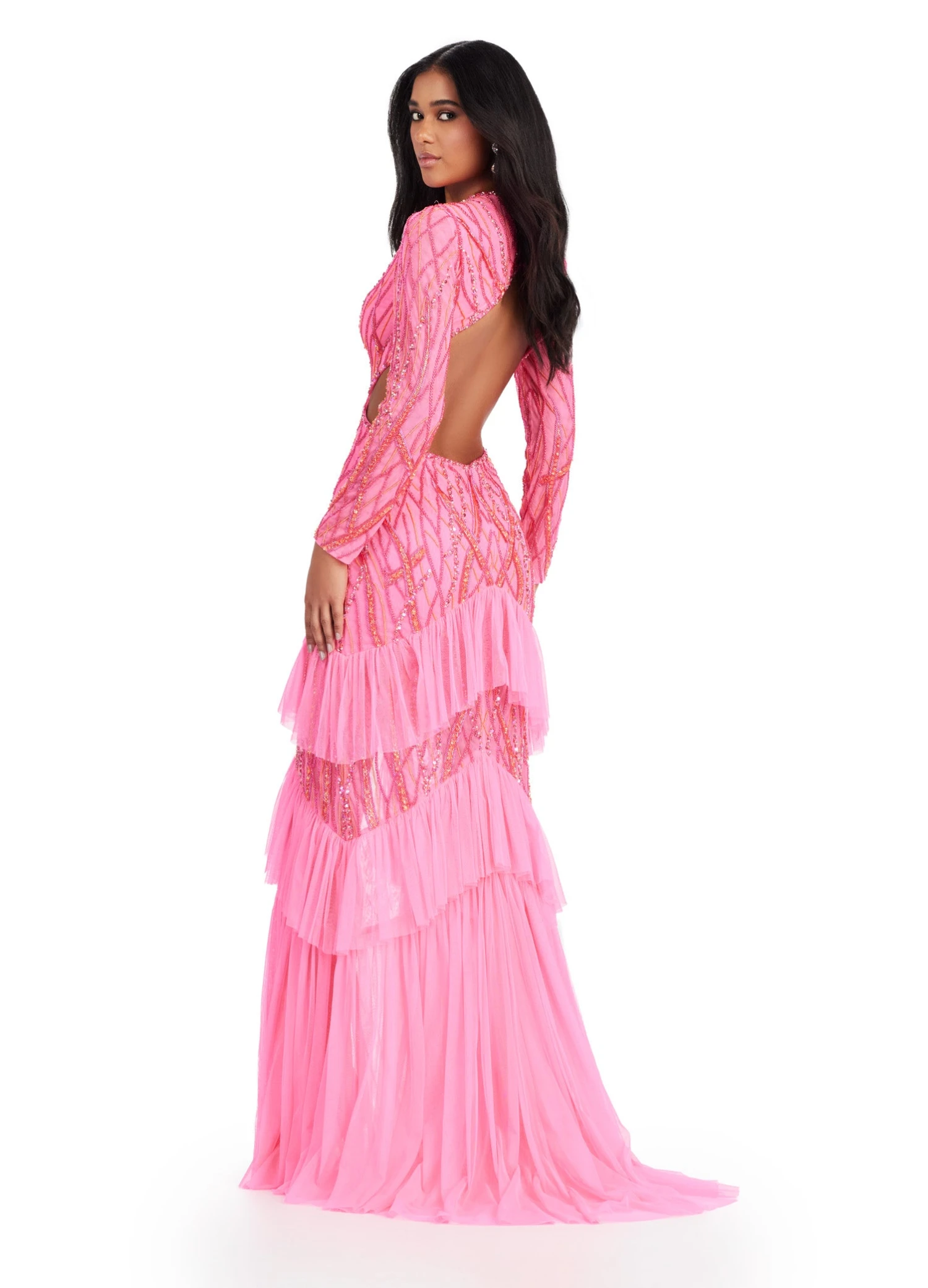 Fully beaded for a radiant shimmer, the gown features long sleeves, an open back, and a centre slit, offering a blend of sophistication and sultriness.