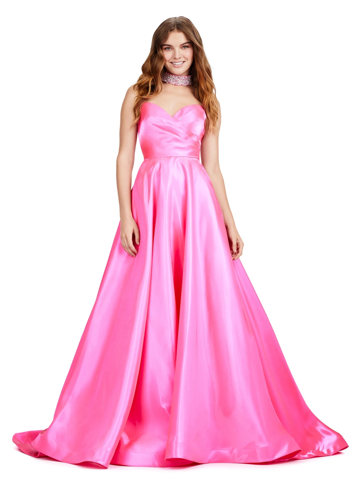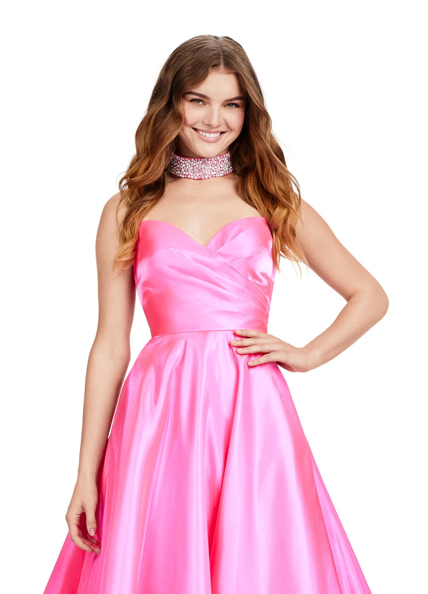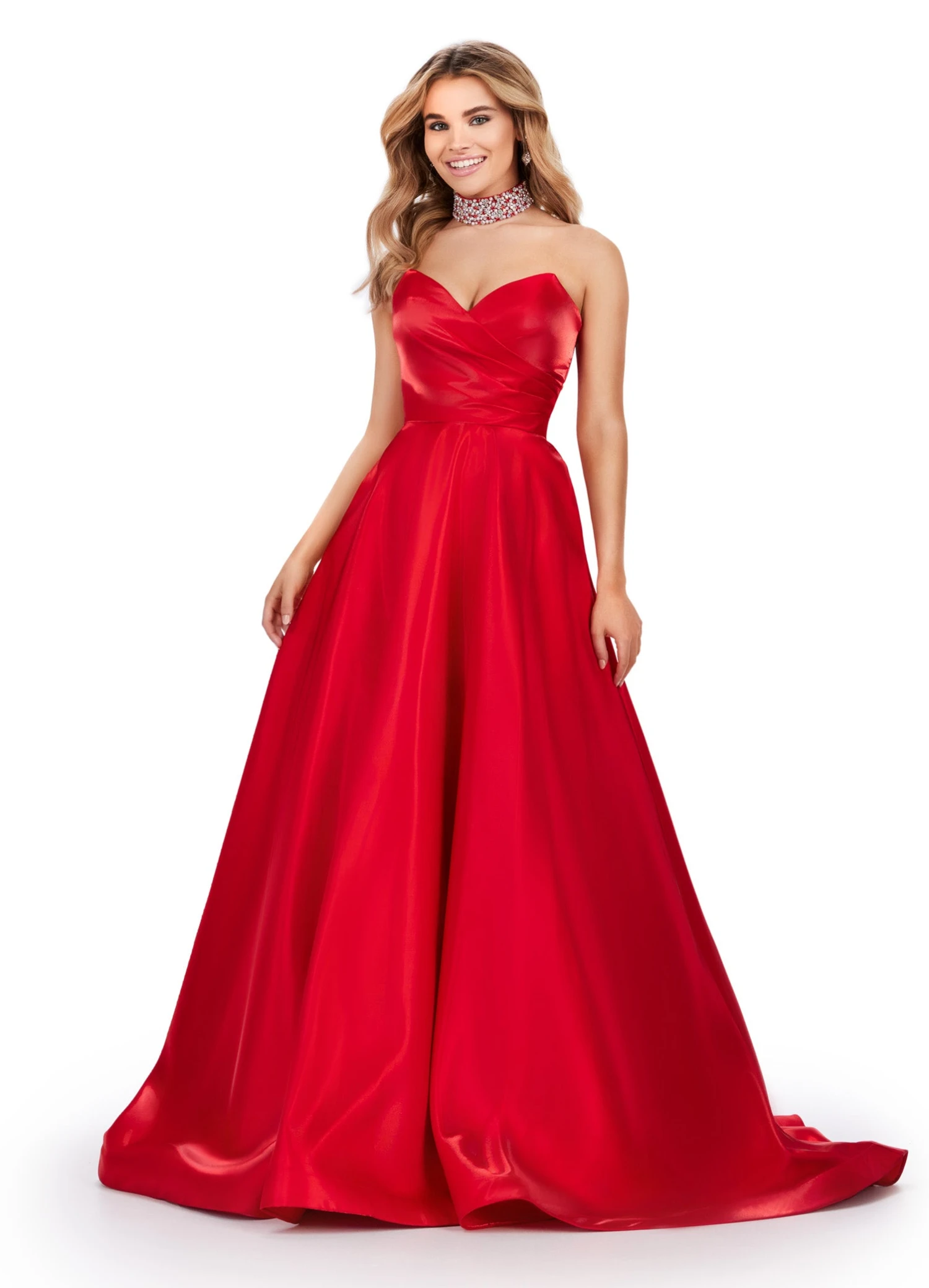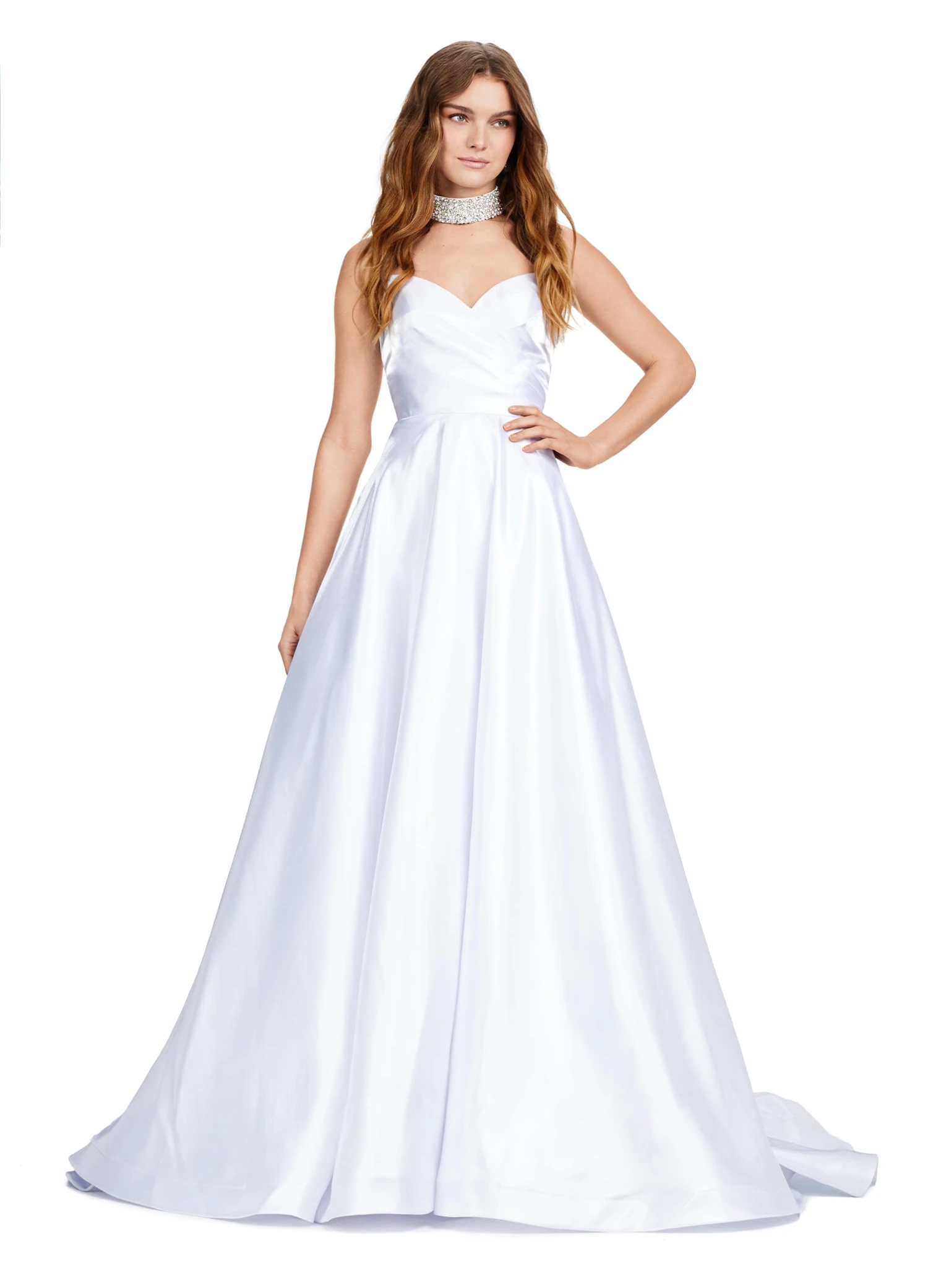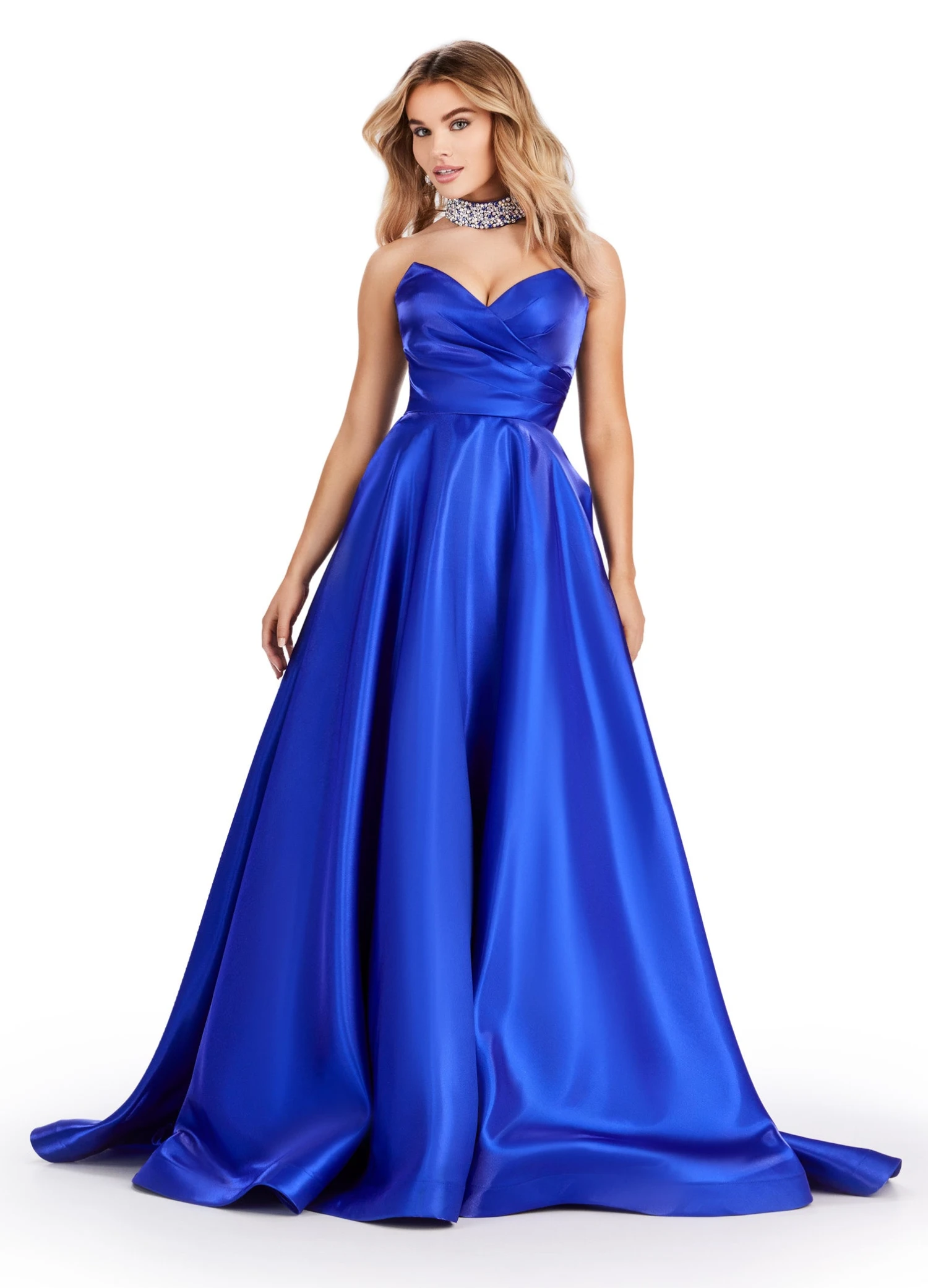 The strapless satin bodice and flattering sweetheart neckline are complemented by a fully beaded choker, adding an extra layer of glamour to the stunning A-line silhouette.