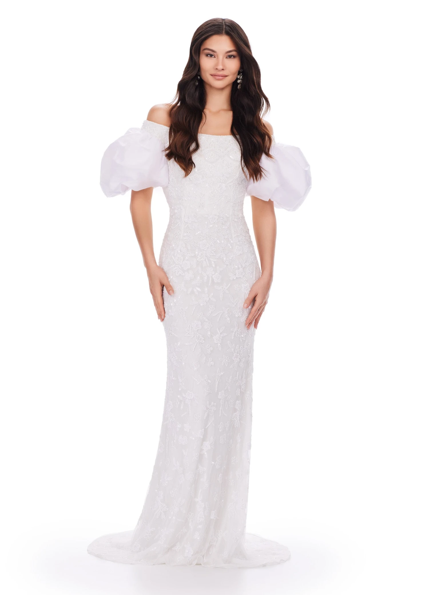 Perfect for galas or red carpet events, this gown combines intricate beadwork with voluminous sleeves, making it a stunning choice for anyone looking to make a bold and unforgettable entrance. ASHLEYlauren 11432.