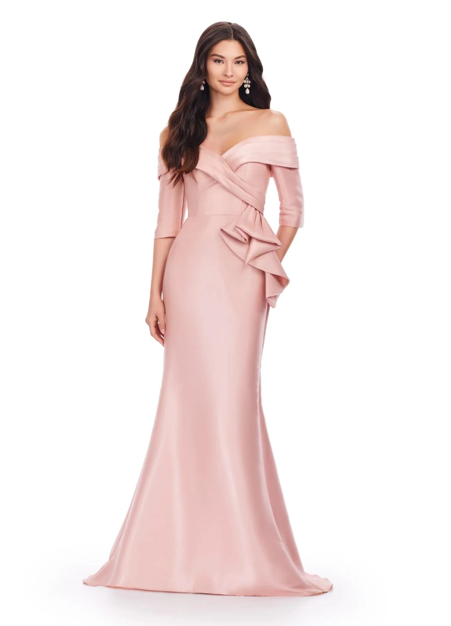 Crafted from luxe phantom satin, she features an off-the-shoulder neckline and cascading hip ruffle that enhances her timeless mermaid silhouette.
