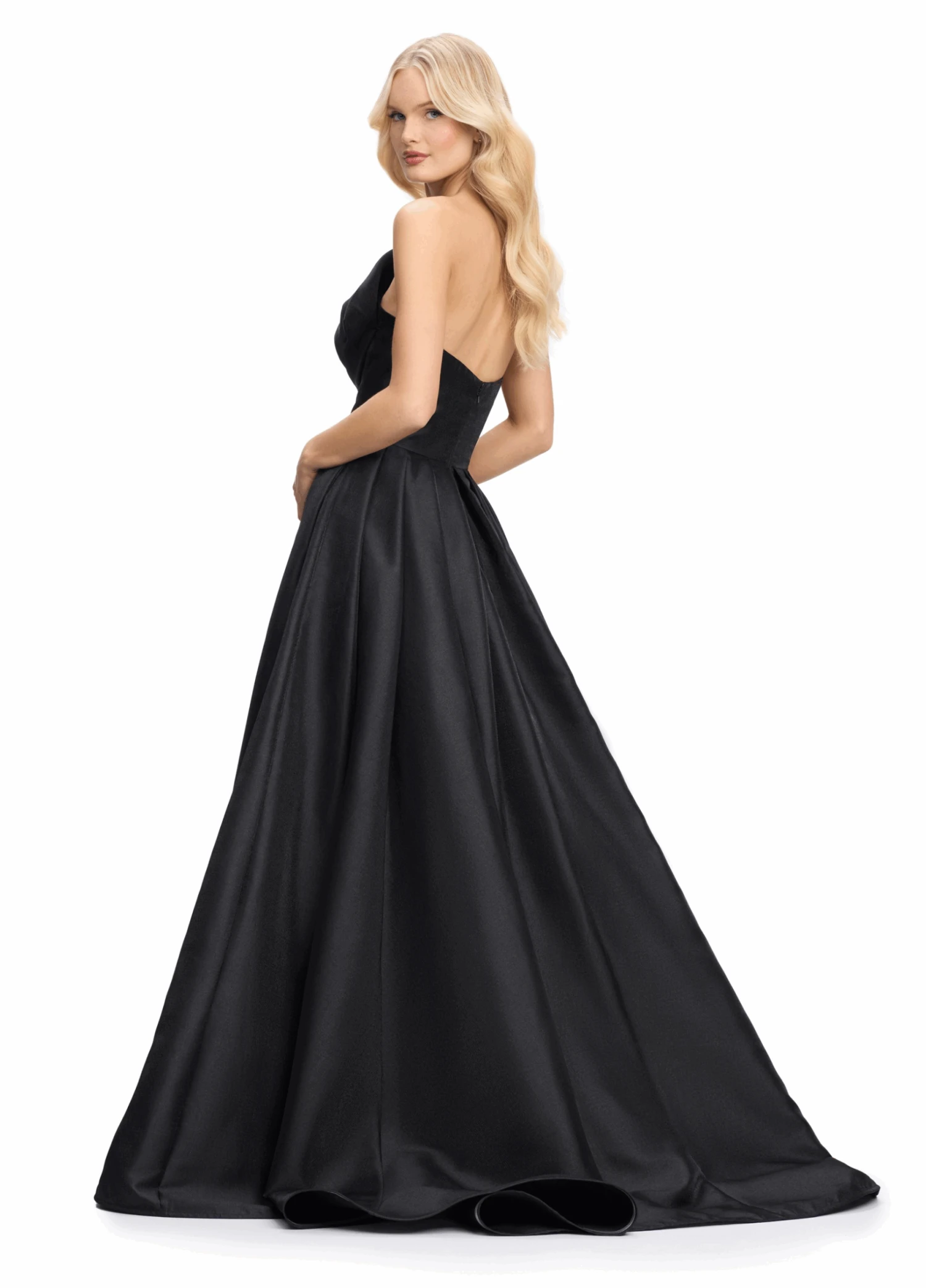 With an asymmetrical oversized bow, luxurious Mikado fabric, and a flattering strapless neckline, she moves with graceful volume and unmatched charm.