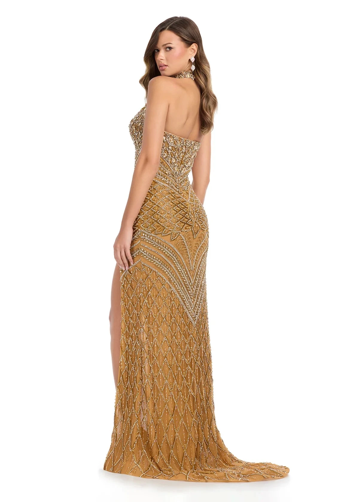 With an intricate hand-beaded design, V-neckline, matching beaded choker, and a sultry left leg slit, she’s finished with a sweeping train for added grace.