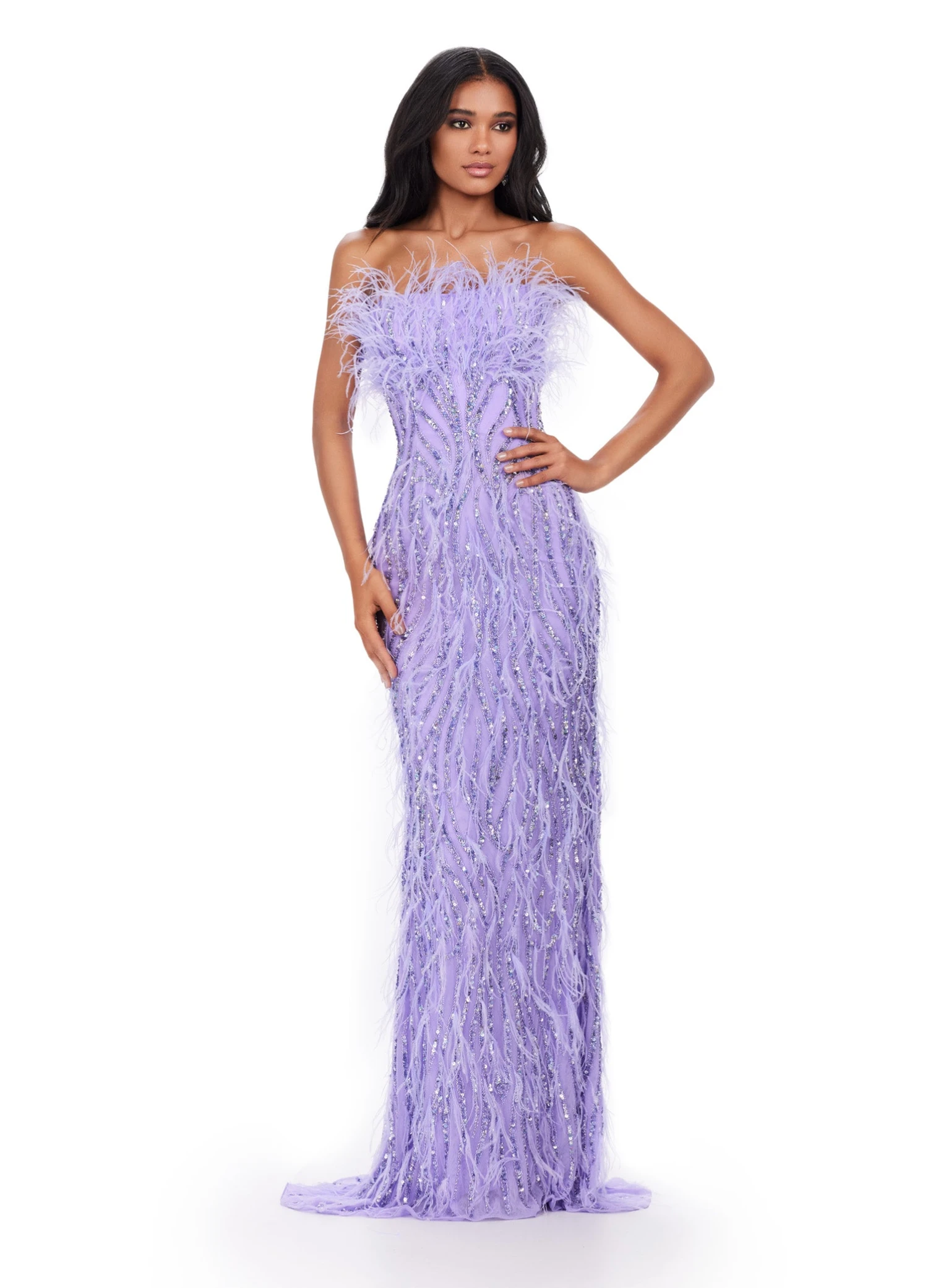 Featuring a fully beaded strapless design, the gown showcases intricate beadwork that creates a luxurious pattern, ensuring a dazzling effect with every step. The playful feather accents bring drama and texture, adding a fun and high-fashion edge to the look.