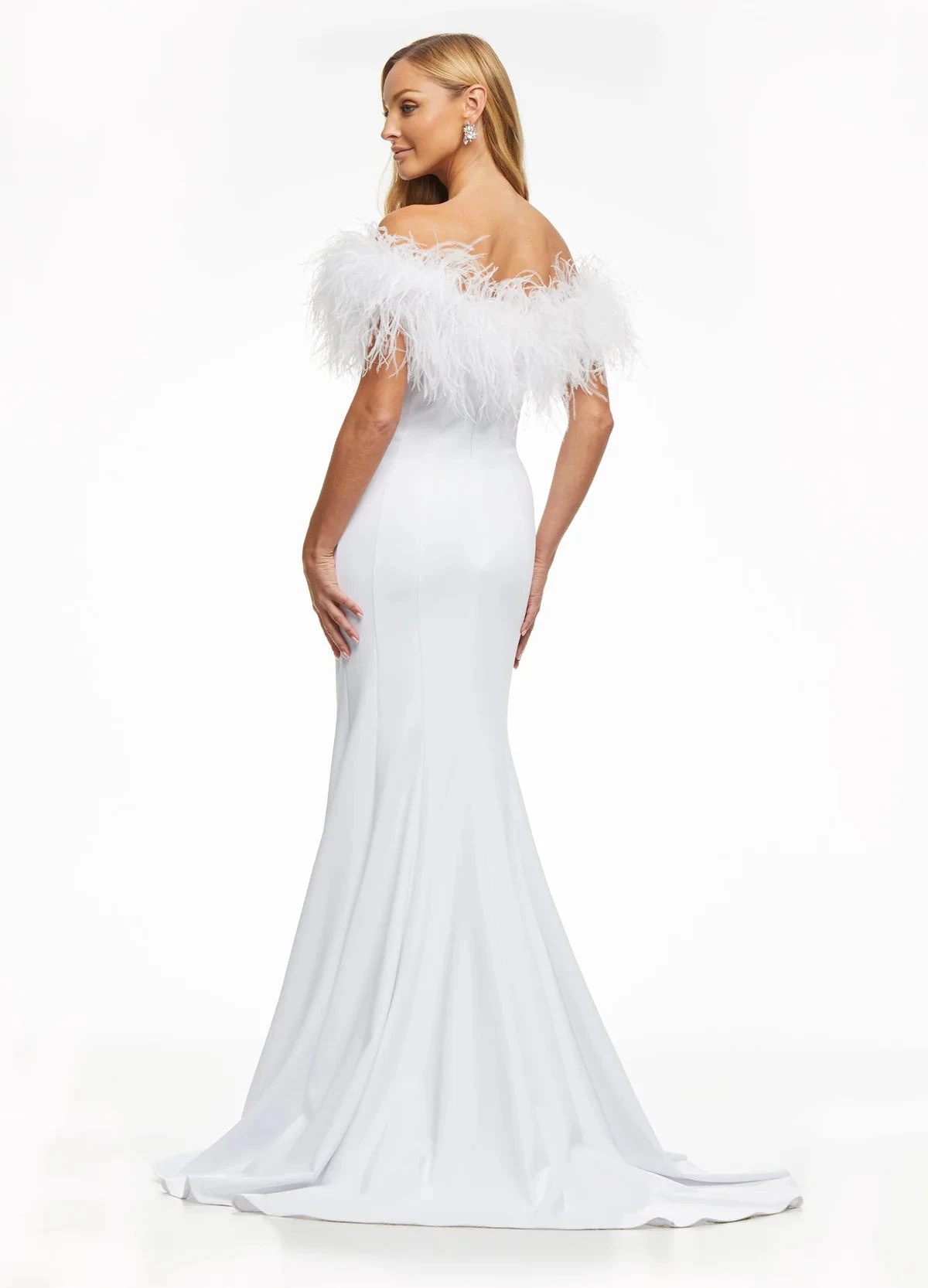 The Genevieve Gown is pure glamour with a bold twist. She’s dramatic, feathered, and designed to dazzle.