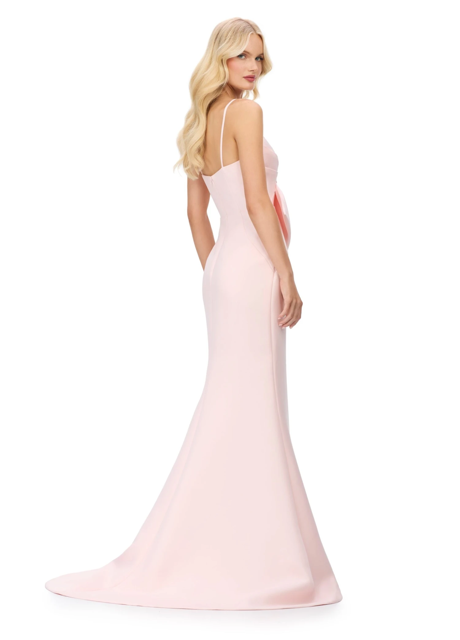With a mesh V-neckline, oversized bow, and luxurious satin fabric, she moves with grace and sophistication.