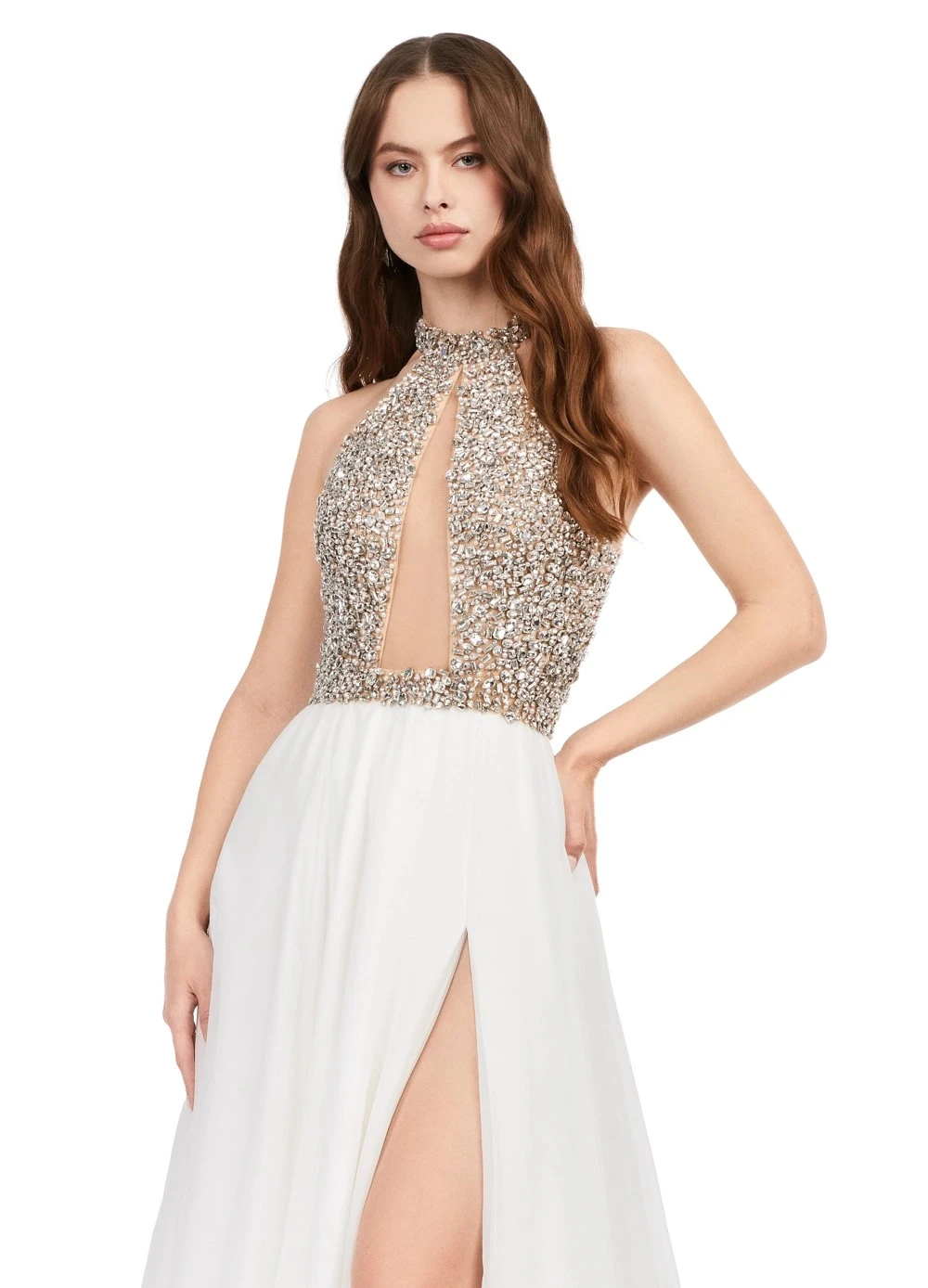 The jewel-encrusted bodice adds an opulent touch, creating an unforgettable shimmer as you move. The high-thigh split gives her an alluring edge, ensuring all eyes are on you.