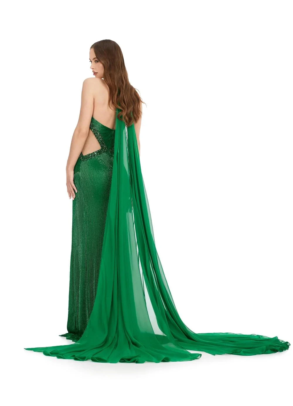 With crystal accents, an illusion cut-out design, and a flowing chiffon cape, she moves with elegance and drama.