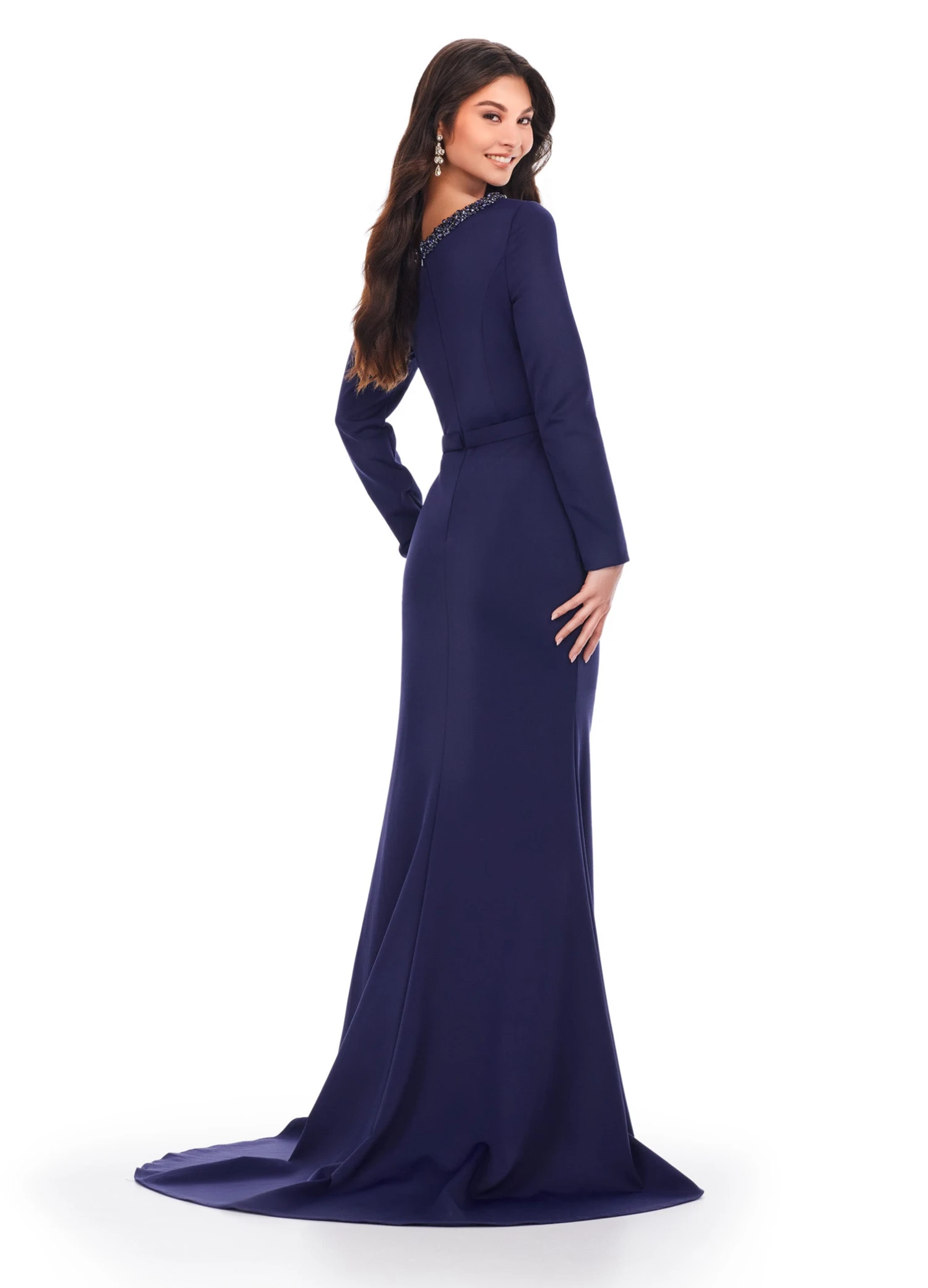 Crafted from structured scuba fabric, this long sleeve gown hugs your curves beautifully, while the asymmetric beaded neckline adds a touch of glamour and sparkle, elevating the overall design. The gown’s clean lines and form-fitting silhouette ensure both elegance and comfort.