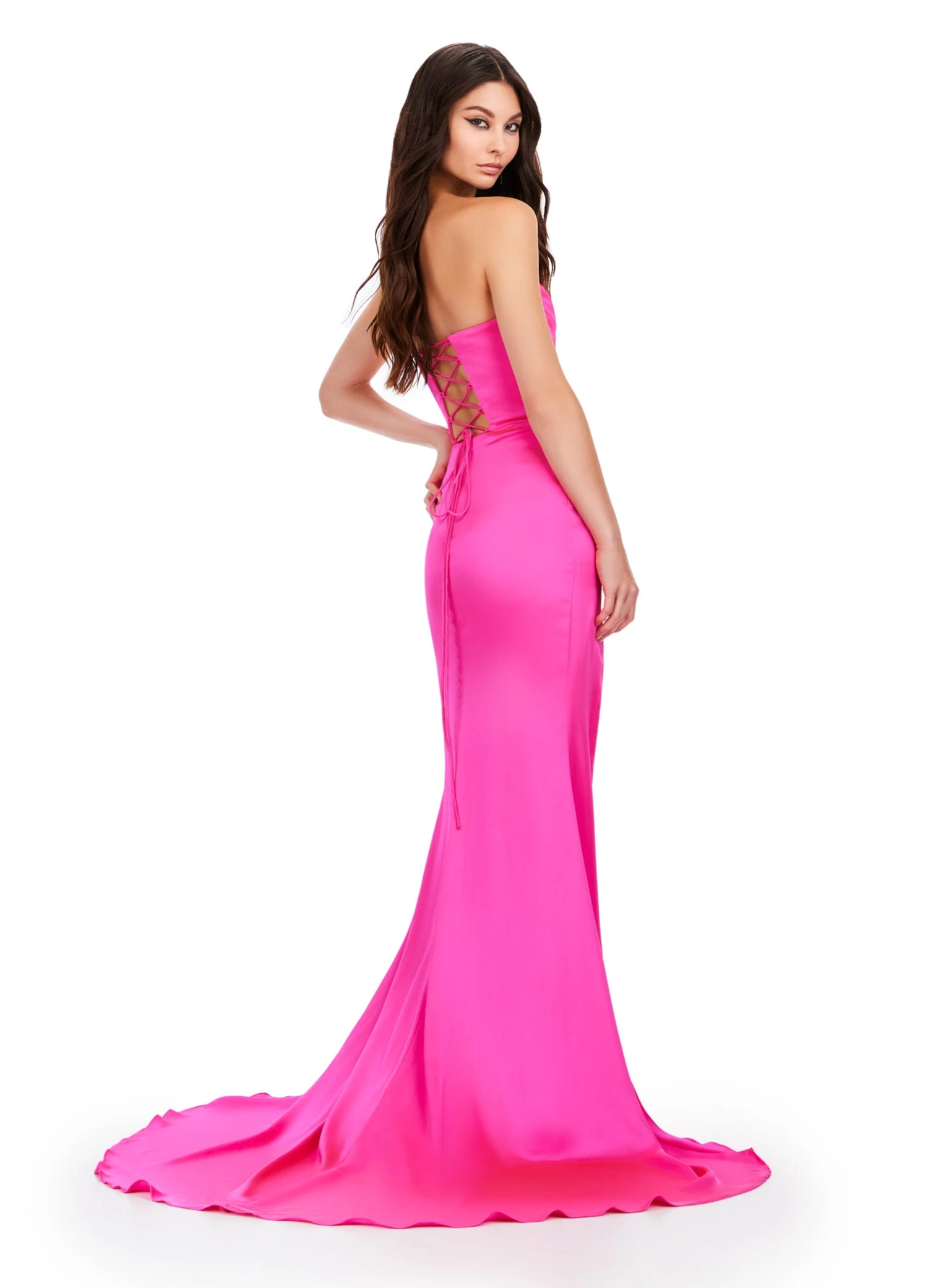 With a strapless satin silhouette, ruched detailing, and a lace-up back, she’s designed to flatter and captivate. The right leg slit adds an alluring touch, ensuring you stand out with sophistication and style.