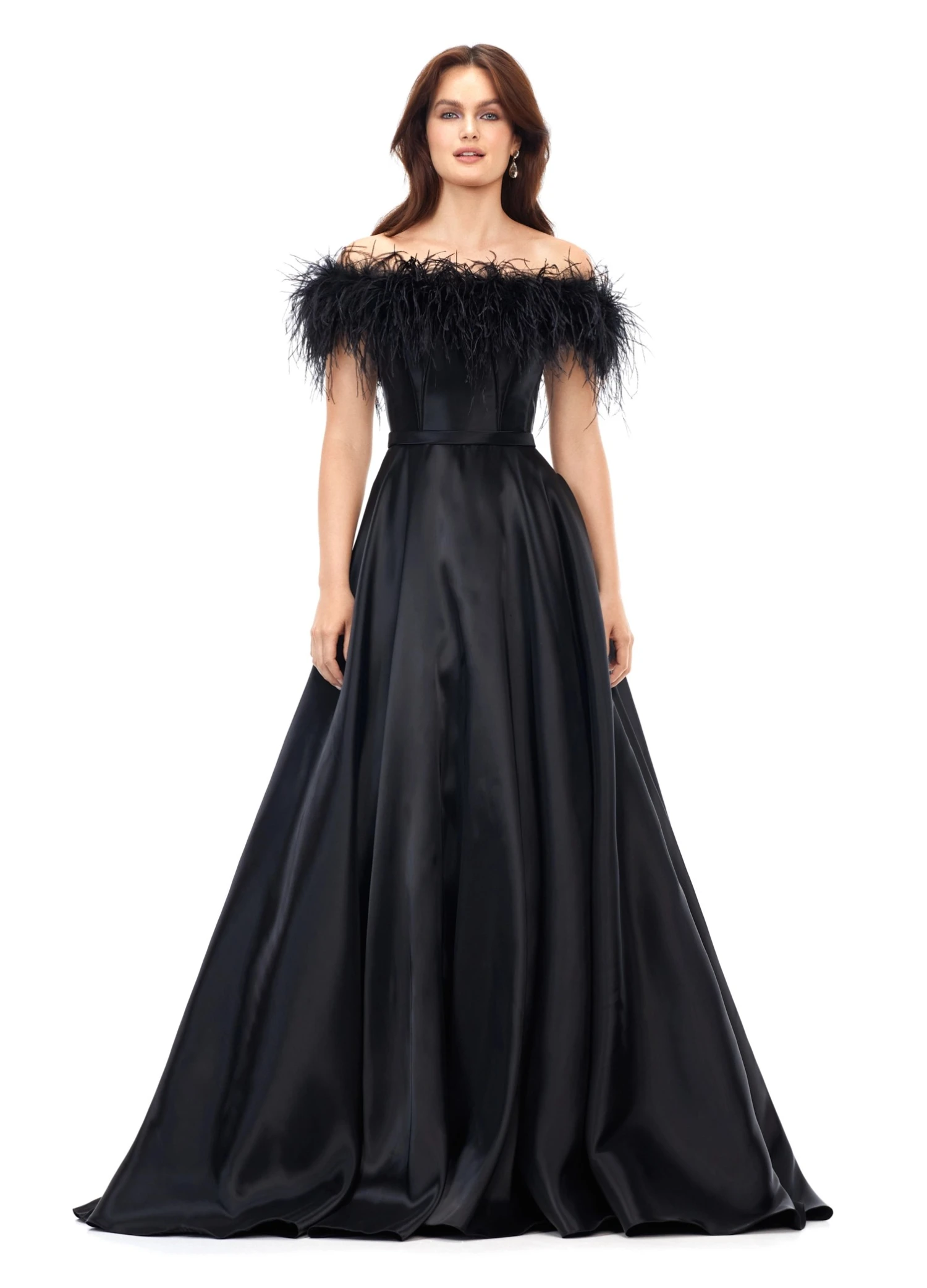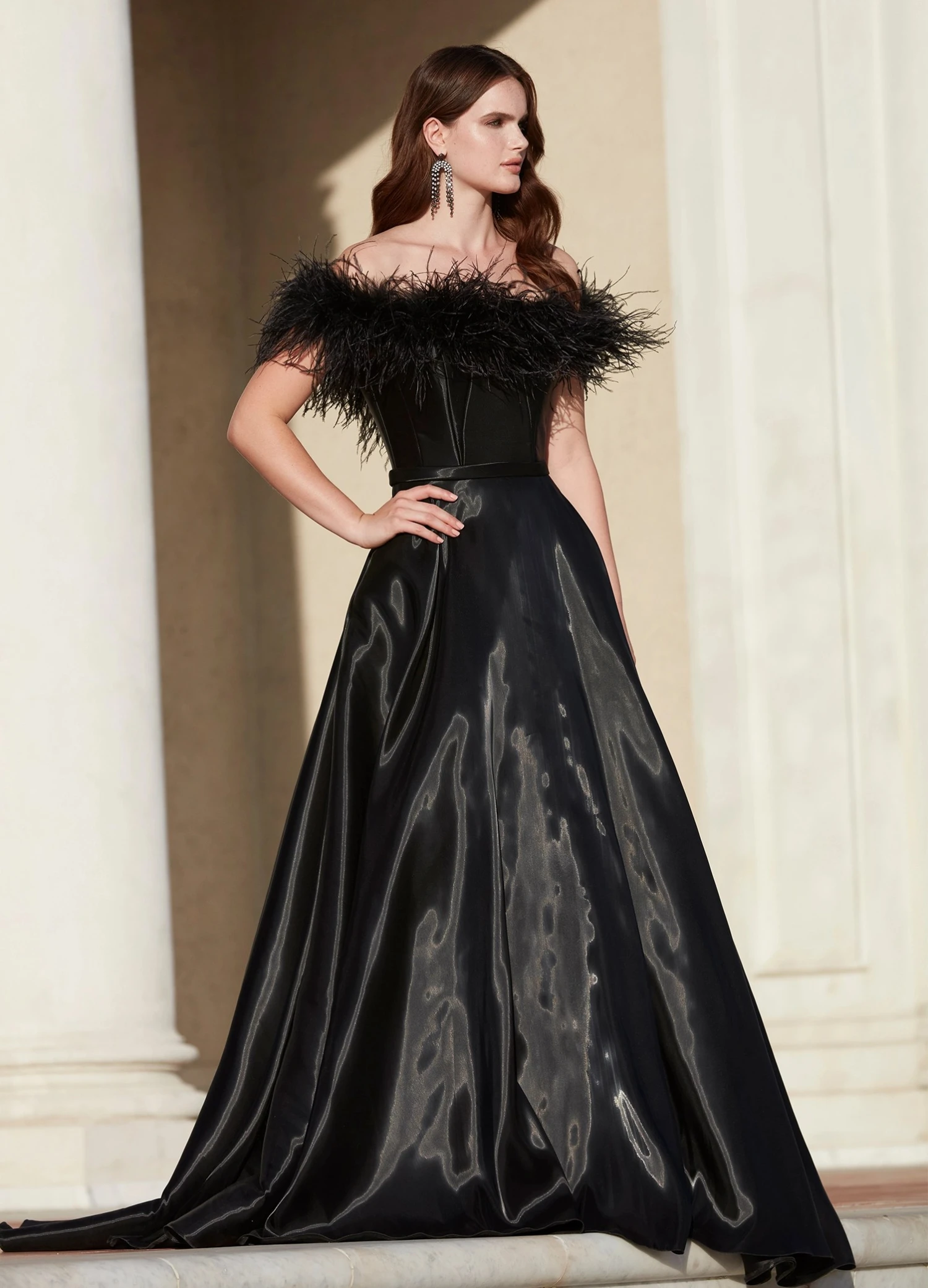 The off-shoulder neckline and luxurious feather detailing add a bold, high-fashion touch, while the fitted bodice emphasizes your waist, creating a flattering hourglass silhouette.