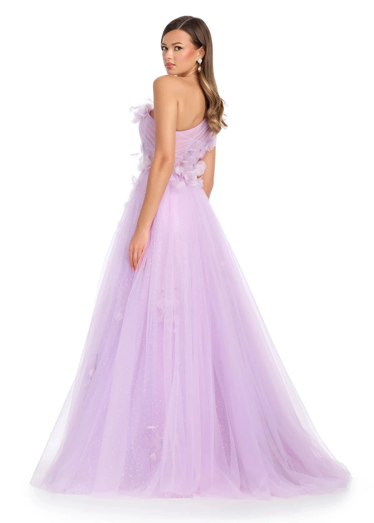 With a one-shoulder bustier, intricate floral accents, and a full glitter tulle skirt, she blends sophistication with ethereal charm.