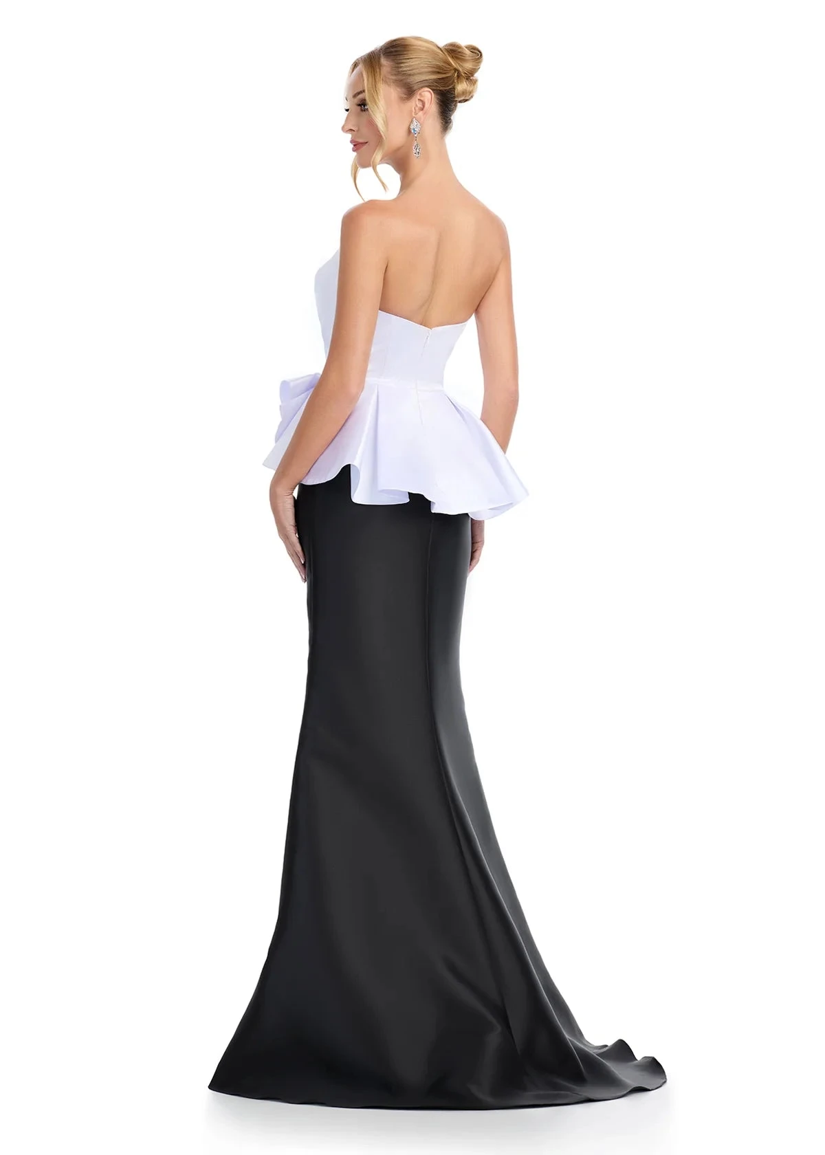 With asymmetrical pleating, a peplum waist, and a mermaid skirt that flares at the knees, she’s a perfect balance of shape, drama, and sophistication.