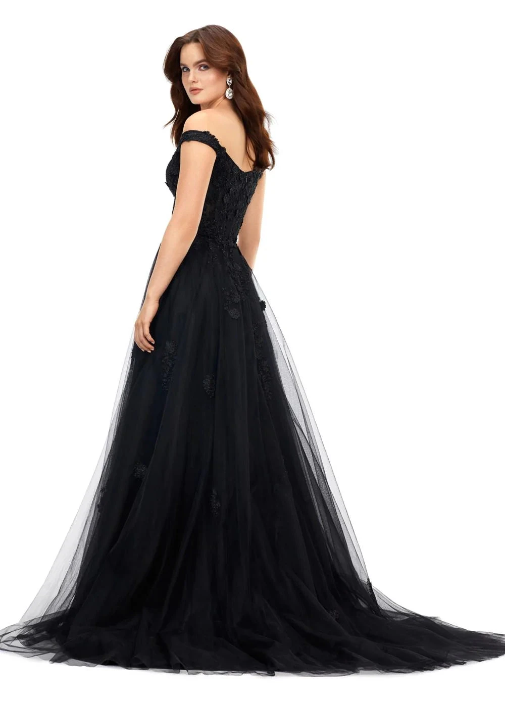 With an off-the-shoulder neckline, illusion corset bodice, and delicate floral lace appliqués, she’s both ethereal and enchanting.